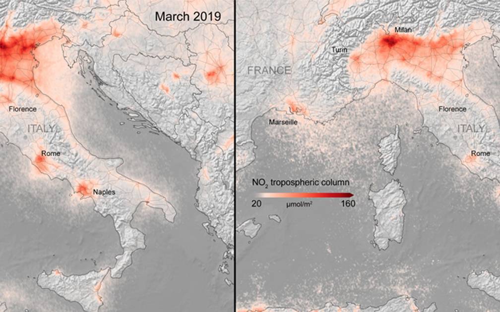 Dies sei vor allem in den Metropolen Paris, Madrid und Mailand deutlich geworden. Die Satellitenbilder, die die ESA zur Verfügung gestellt hat, belegen das.